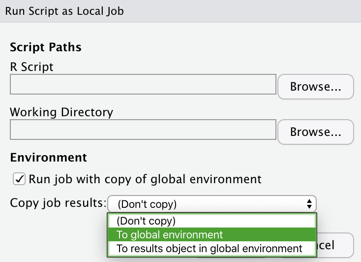 그리고 밑에 있는 Copy job results는 [To global enviroment]를 설정해서 Start를 하면