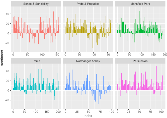 - 이를 가지고 조금 더 활용하면 Austen의 각 소설에서 가장 부정적인 챕터가 무엇인지 확인해볼 수 있습니다.