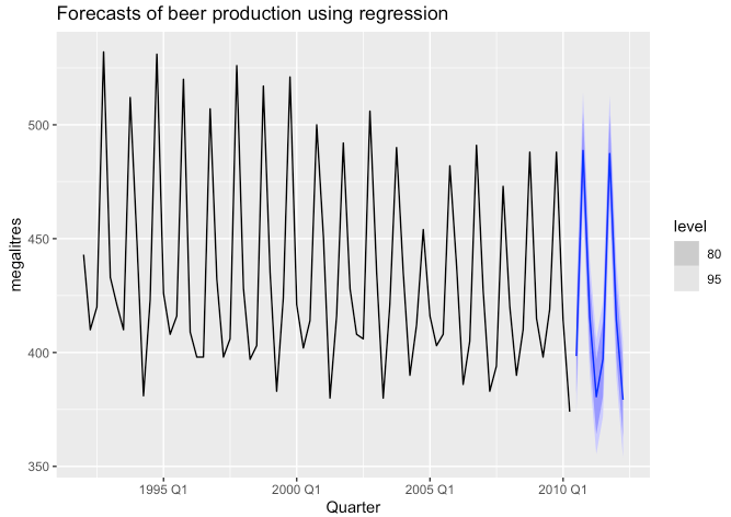TSLM()함수는 시계열 데이터를 선형회귀모형에 적합시켜줍니다.- 물론 가장 널리쓰이는