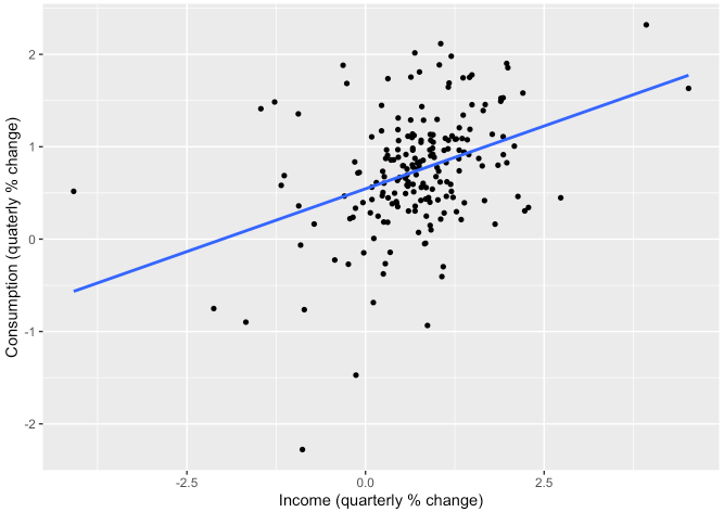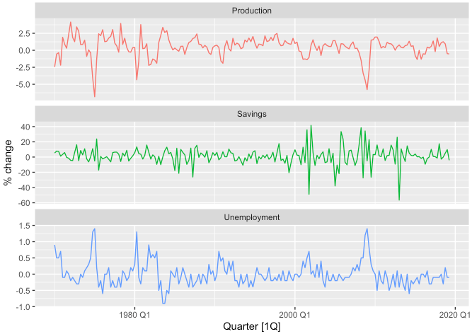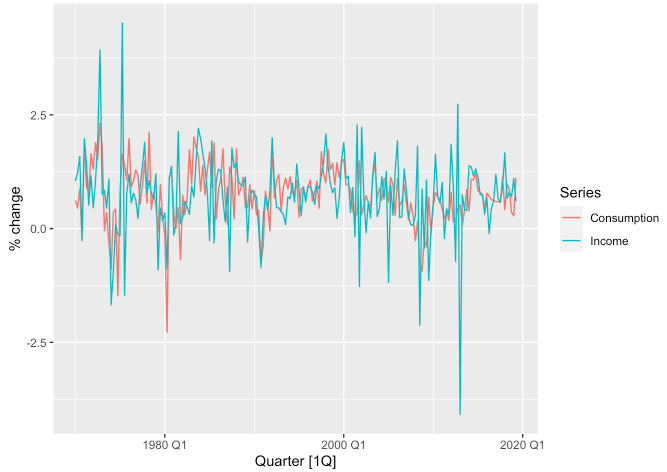 us_change로tsibbledata라이브러리 내에 있습니다.- 1970년 1분기부터 2019년 2분기까지 미국의 개인 소비 지출(personal consumption expenditure)과 개인 소득(personal disposable income)의 분기별 변화(성장률) 시계열 데이터입니다.