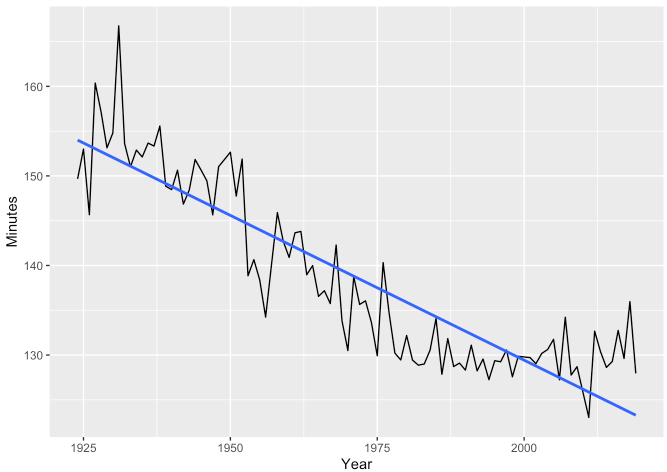 labs(y = "Minutes", title = "Boston marathon winning times")