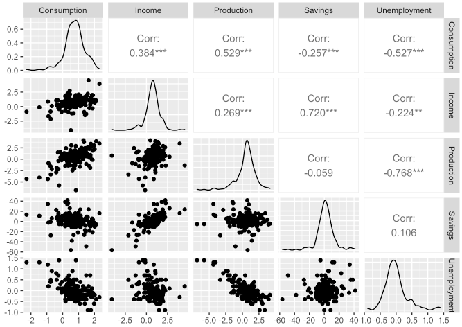 - 바로 예시로 적용해보겠습니다. 소비 지출을 예측하는 데 있어서 개인 소득뿐만 아니라 산업 생산과 개인 저축, 실업률을 포함하여 보고자합니다.