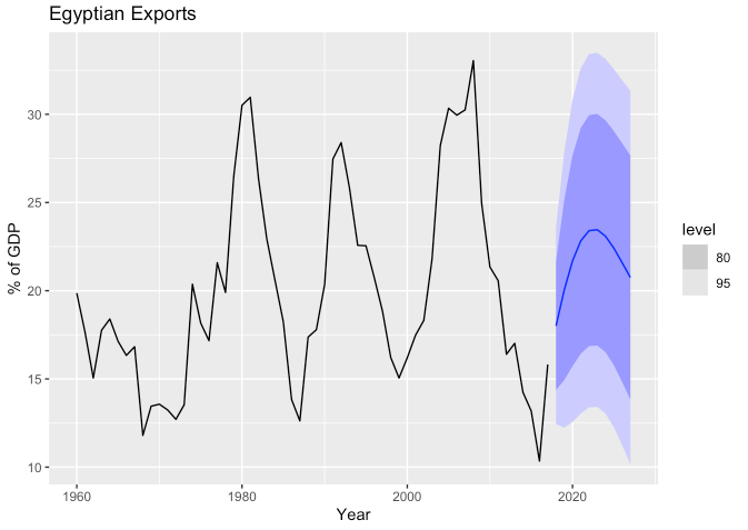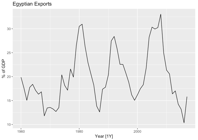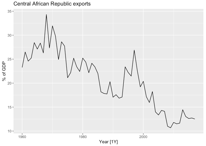 labs(y = "% of GDP", title = "Central African Republic exports")